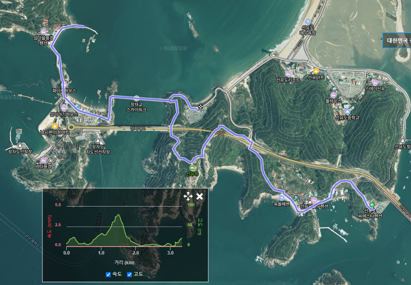 바닷길(2) 코스 : 선유도 물량장 공영주차장-선유봉(112m)-장자대교-대장봉(142m)-선유도 수원지 주차장 도착 (3시간30분, 6km)
