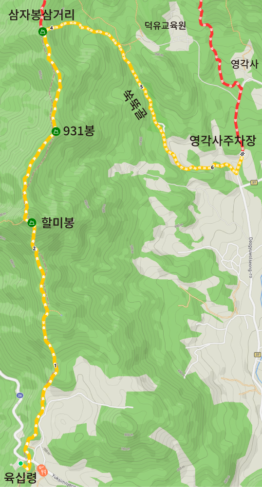 A코스와 같이 육십령을 출발하여 할미봉, 삼자봉삼거리까지 약 4km를 함께 진행한 후 갈림길에서 오른쪽 길인 영각사주차장 방향으로 하산하는 코스입니다(A코스는 직진).